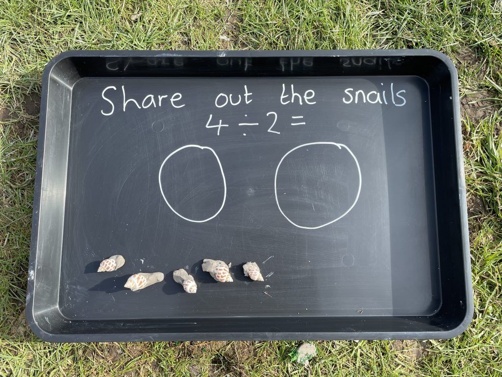 - Division: as a class, make lots of little snails. Use clay and shells; baker ross are the perfect place to go. Depending on your children’s skills set, think about how many snails you will all make. Let the clay dry. Do this as a whole class or individually in trays or on a tuff spot. Draw two circles and ask the children to share the snails out! Dive in deeper by drawing three or four circles and increase the amount of snails they share out. Offer a pen to write their calculations down.